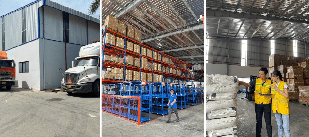 Hệ thống kho được quy hoạch và bố trí khoa học, lắp đặt các khung, kệ, giá đỡ phù hợp với đa dạng các loại hàng như: nông sản, thủy sản, thanh long, tinh bột sắn... Quy trình lưu trữ, bảo quản được thực hiện nghiêm ngặt và giám sát toàn diện, đảm bảo an toàn và chất lượng sản phẩm cho doanh nghiệp.